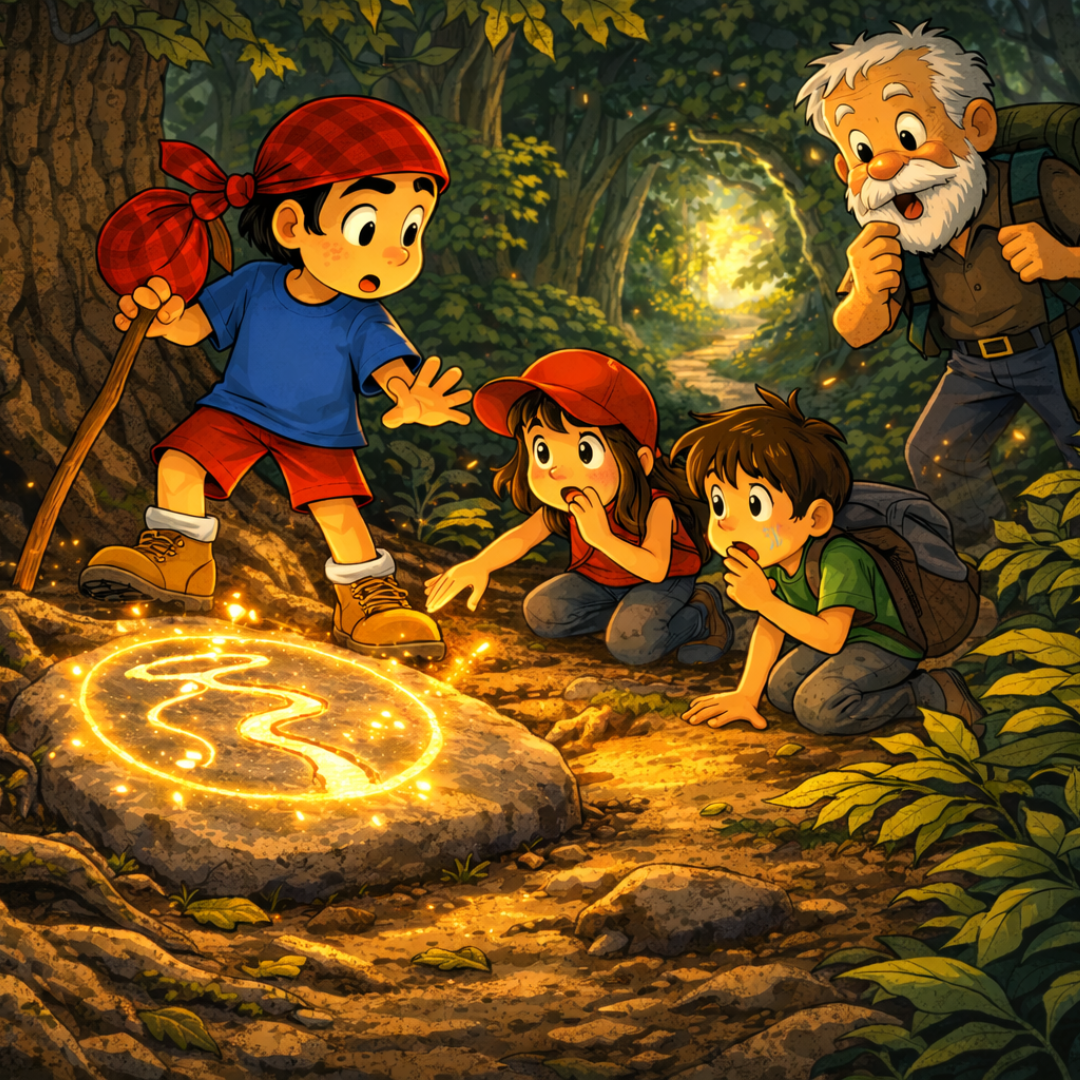 “Een boek over wandelpaden,” antwoordde opa. “Paden die niet voor iedereen zichtbaar zijn.” Het meisje strekte haar hand uit naar de steen. Op het moment dat haar vinger het teken raakte, voelde ze warmte. “Hij lijkt wel te leven,” zei ze verbaasd.